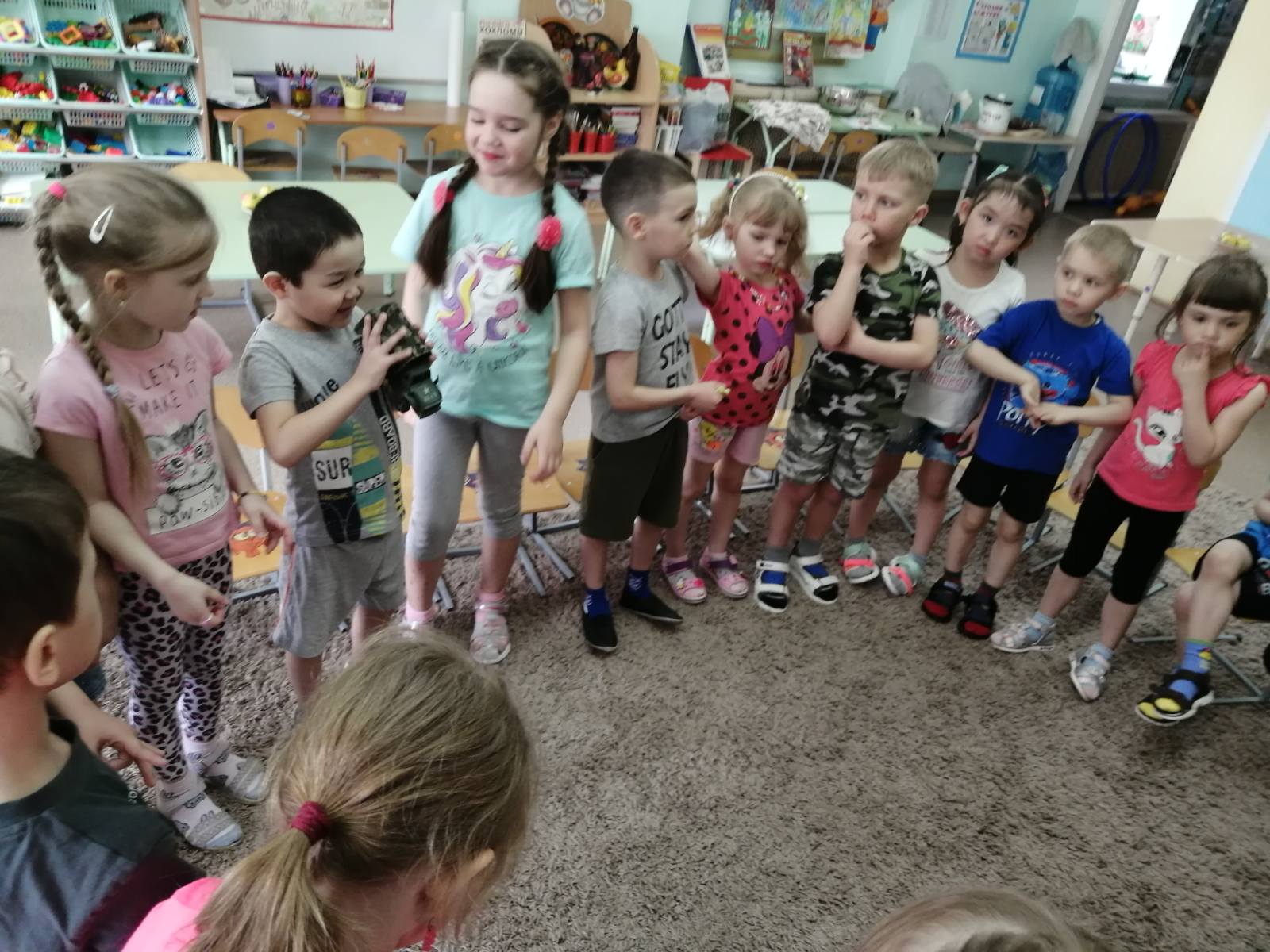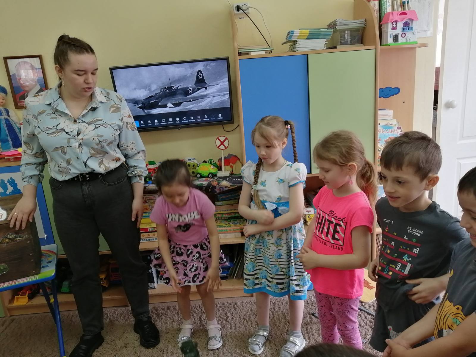 Но тут заметили что в мешке остался самолёт нужно было назвать военные слова(танк, пушка, мина и т д) Последним был конверт с фотографиями прадедушек. Дети рассказали о своих прадедушках, за что они получили медали. И предложили спеть песню посвященную своим прадедушка.