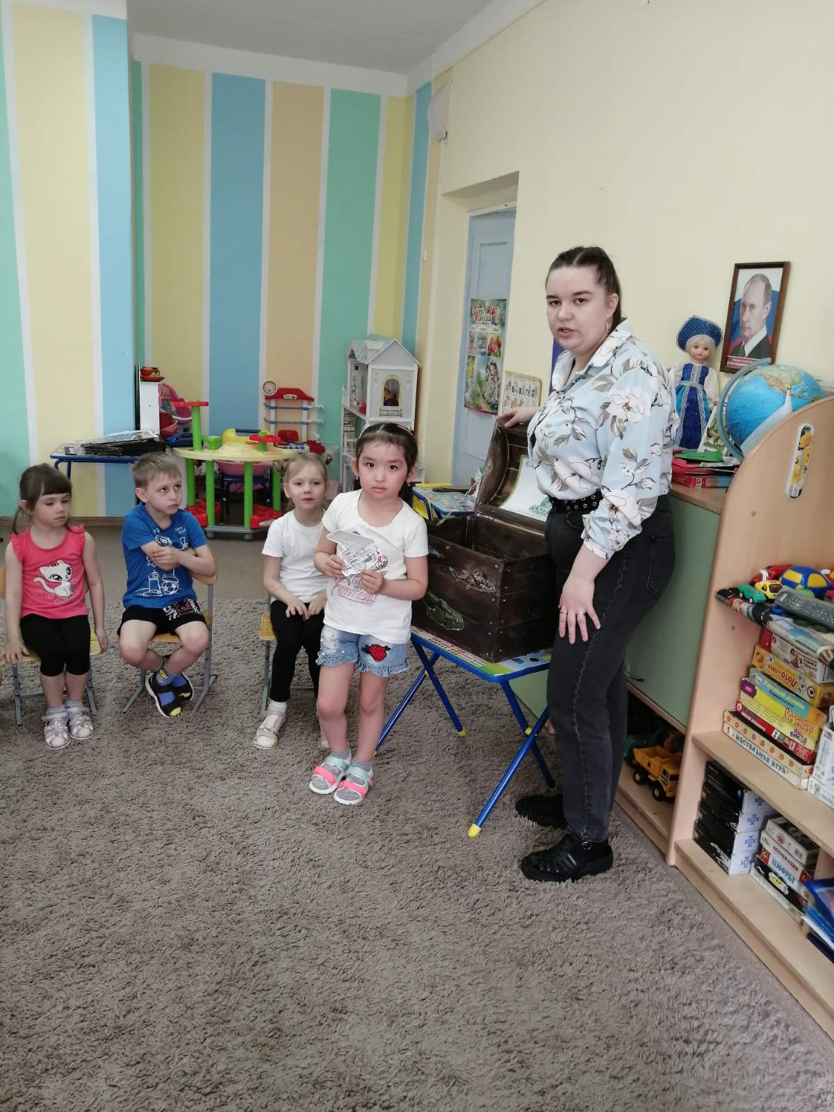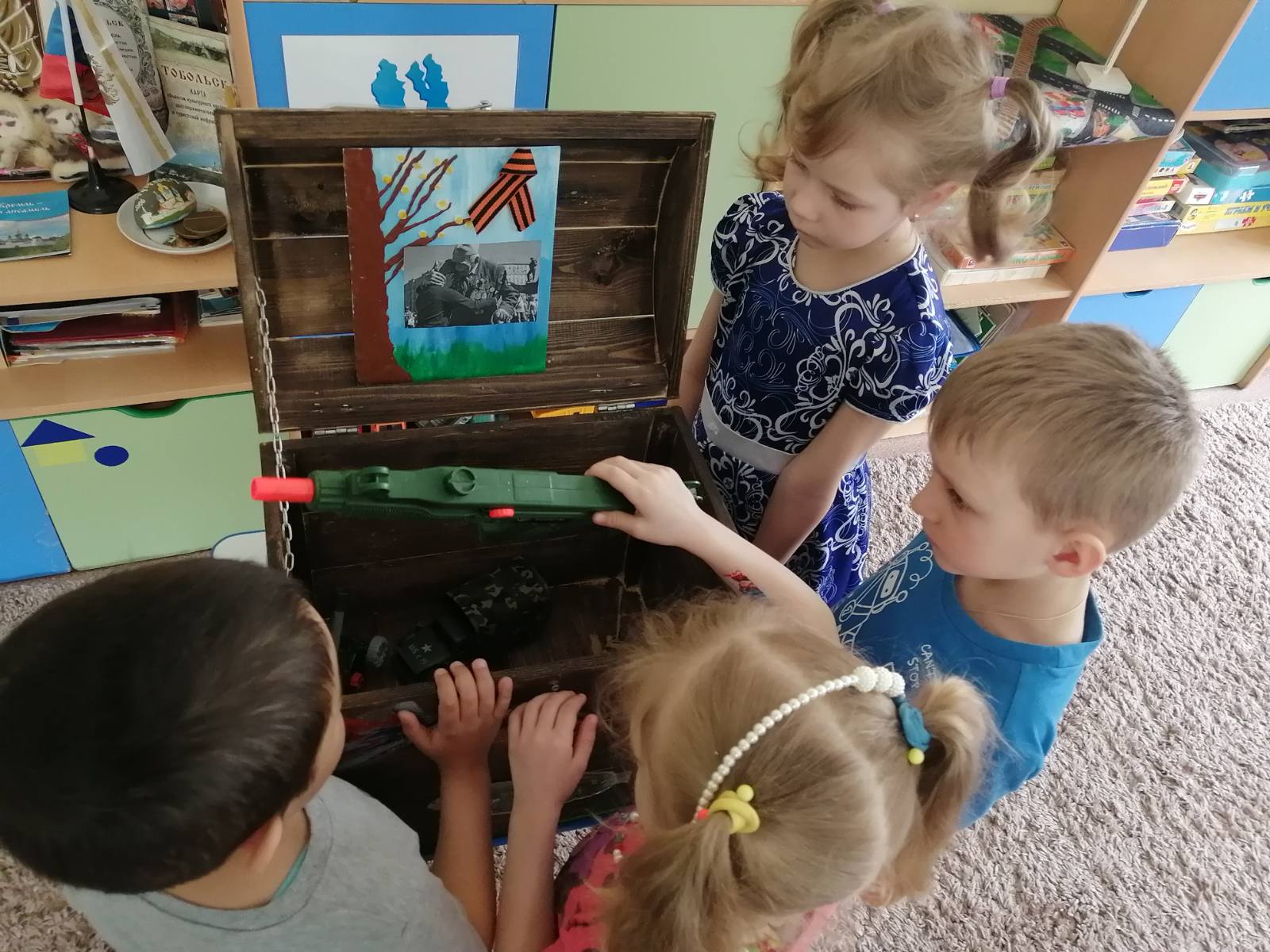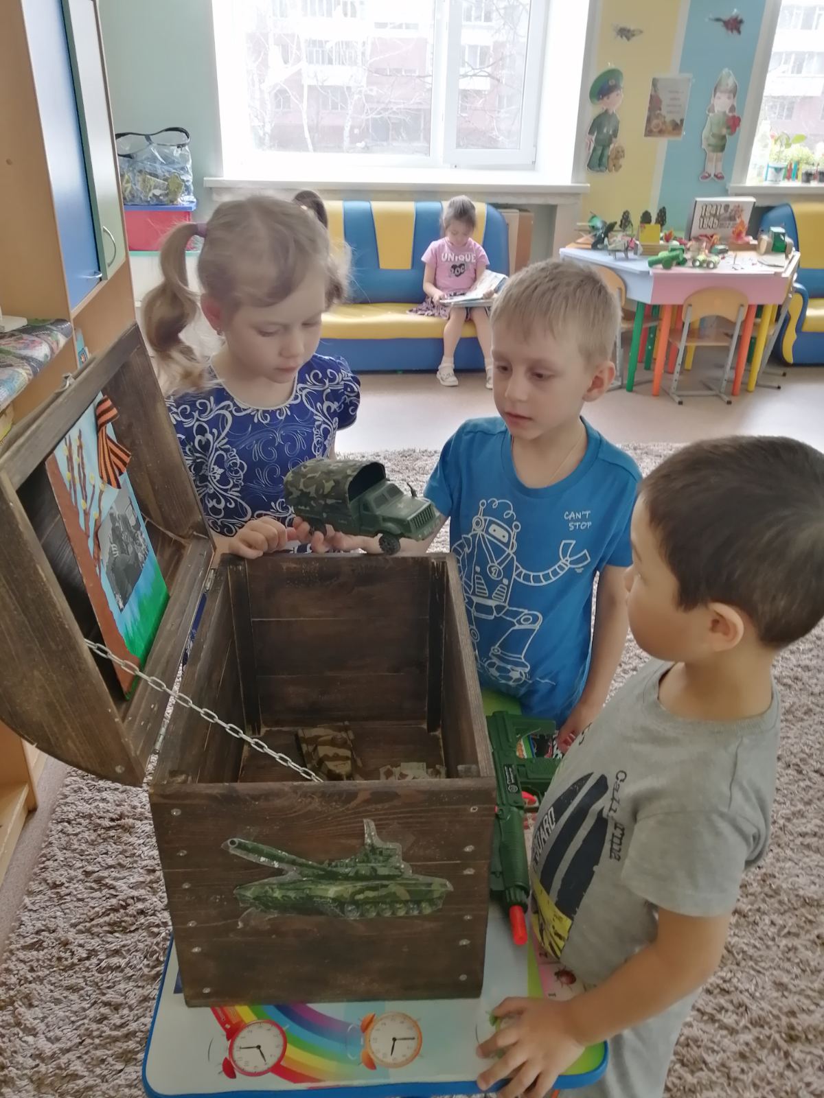 Накануне праздника "День Победы" в группе "Незабудка" появился военный сундучок поколений. Мы увидели, что на нем военные самолёты, машины, танки. Что же интересного он нам приготовил?. И вот тут мы решили заглянуть в наш сундучок, и увидели в нем конверты с заданием.