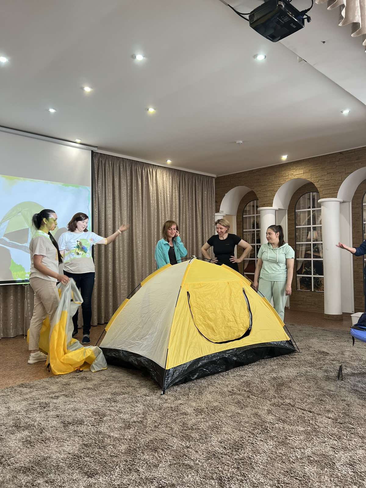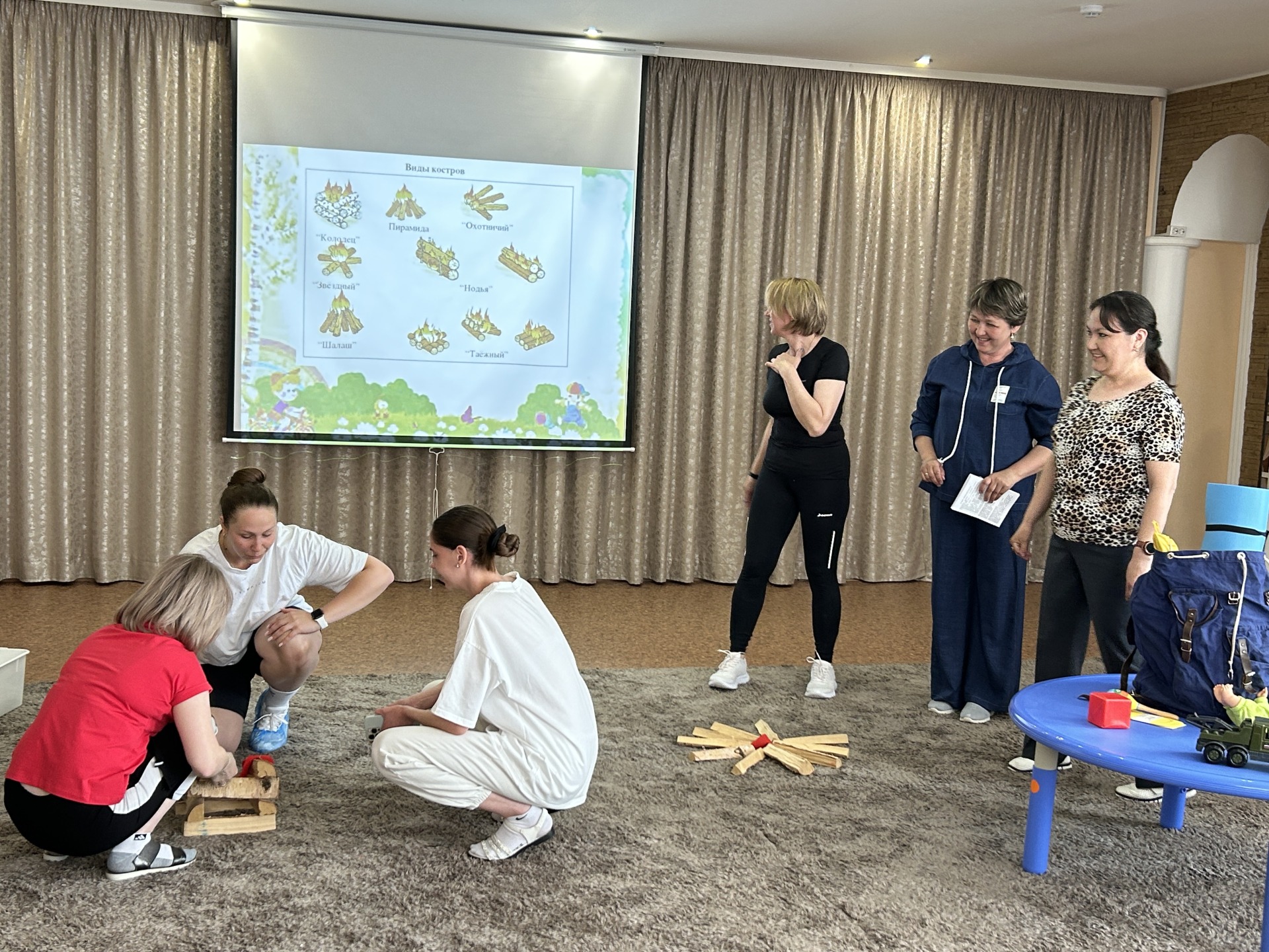 Молодые педагоги приняли участие в практикуме «Физическая подготовка и оздоровление посредством туризма». В ходе данного мероприятия педагог Ценева Наталья Анатольевна закрепила с молодыми педагогами туристские навыки по комплектованию рюкзака, правила разведения костра, практиковались в умении собирать палатку. А еще были посвящены в Юные туристята.