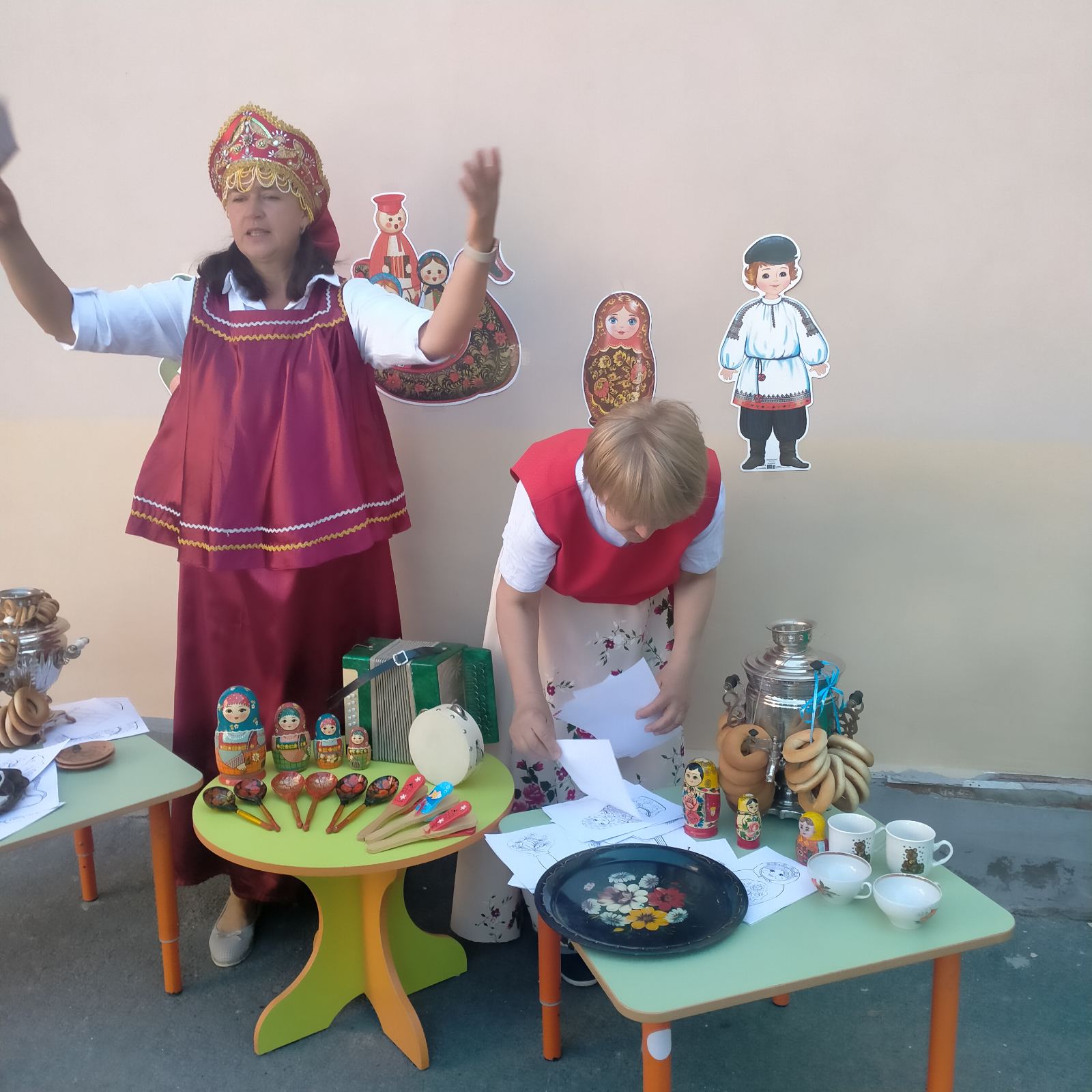Затем ребят пригласили на ярмарку, на которой были представлены неофициальные символы: матрёшка, самовар, балалайка, гармошка, ложки деревянные, русскую берёзку, медведя, лапти, валенки, шапку ушанку. Товар на ярмарке ребята могли приобрести, отгадав загадки, прочитав стихотворение, исполнив песню о России.
