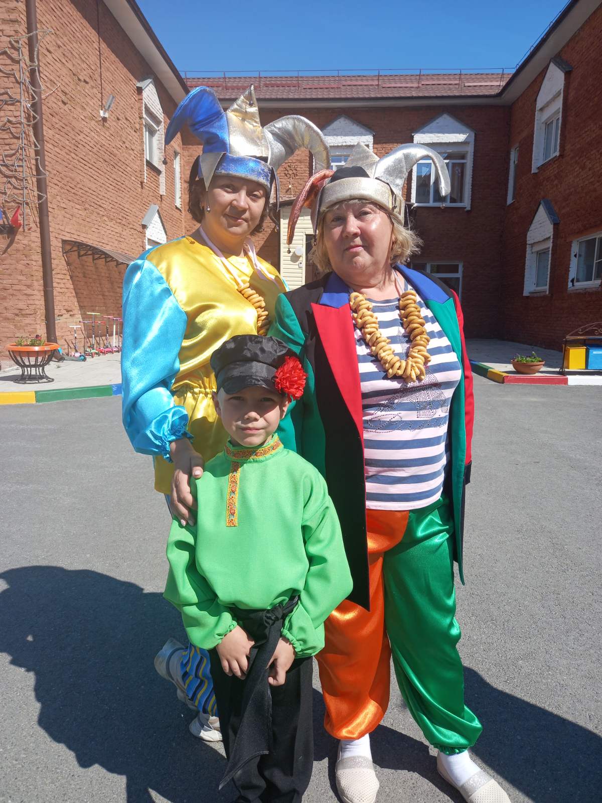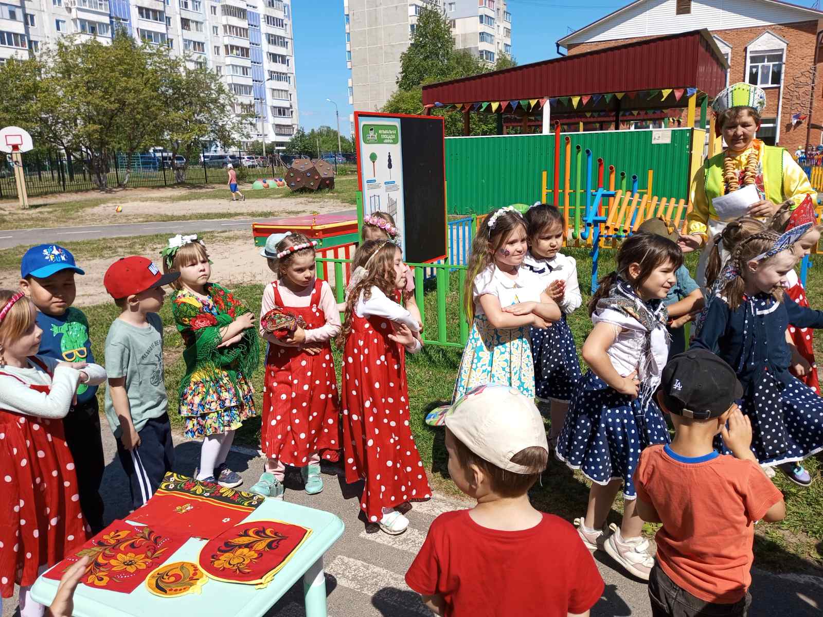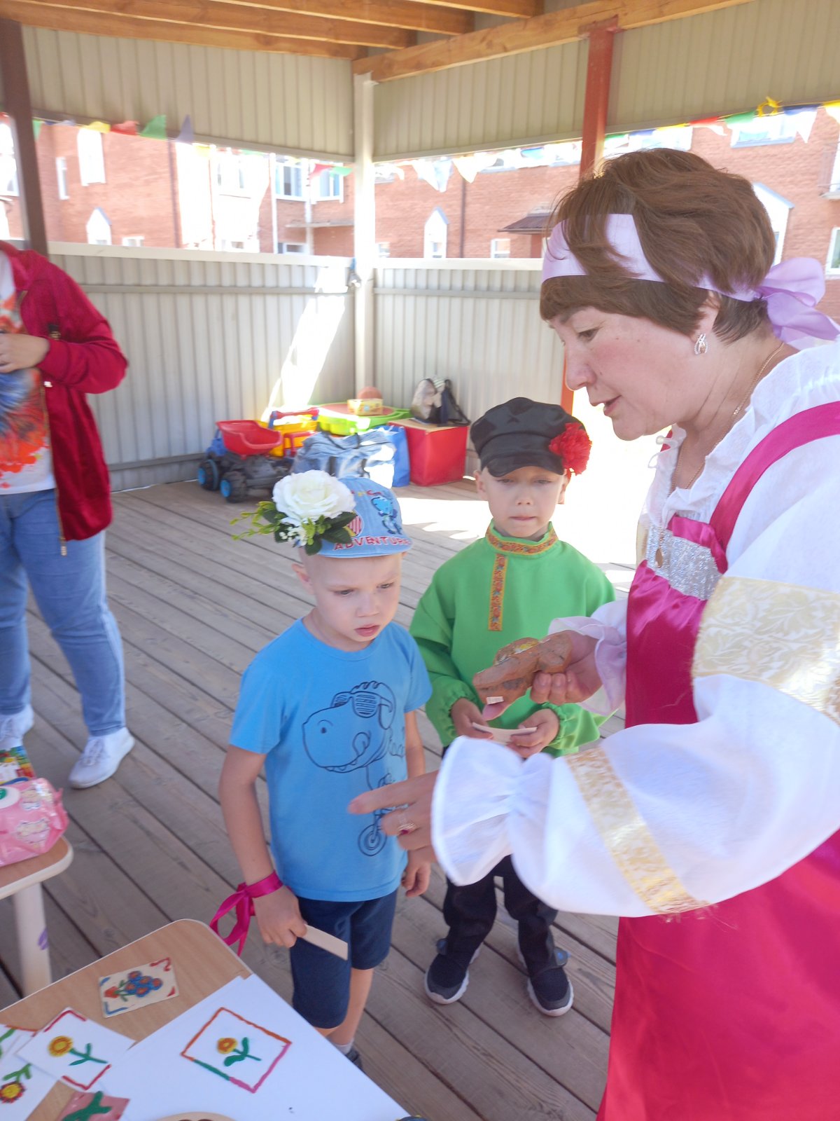 А в торговых рядах встречали детей «Русская матрёшка", веселый оркестр с частушки, народные промыслы, где можно слепить разные фигуркии раскрасить картинки разными росписи.