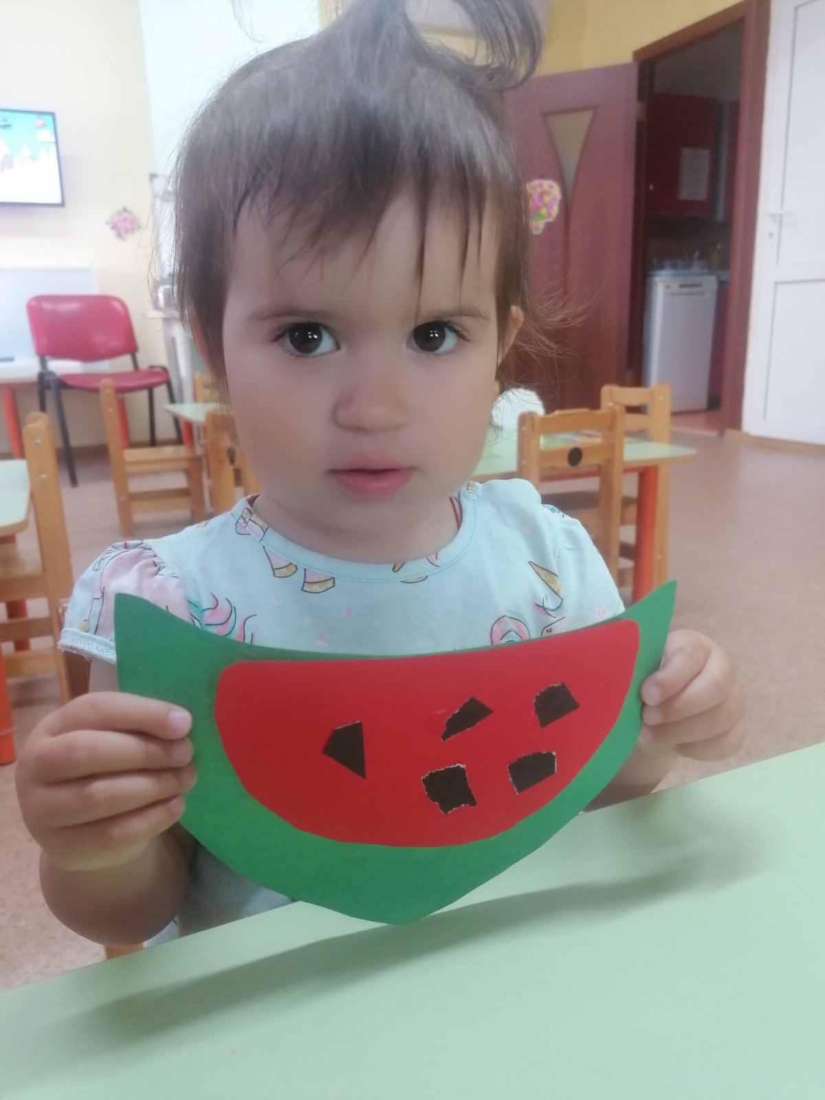 ?Малыши узнали, что арбуз ?- это ягода! Цвет его коробочки бывает разной: от белой и жёлтой окраски, до темно - зеленой, с рисунками в виде сетки, полос, пятен. Мякоть бывает розовая, красная, малиновая. Так же мы читали сказки про арбуз и отгадывали загадки.