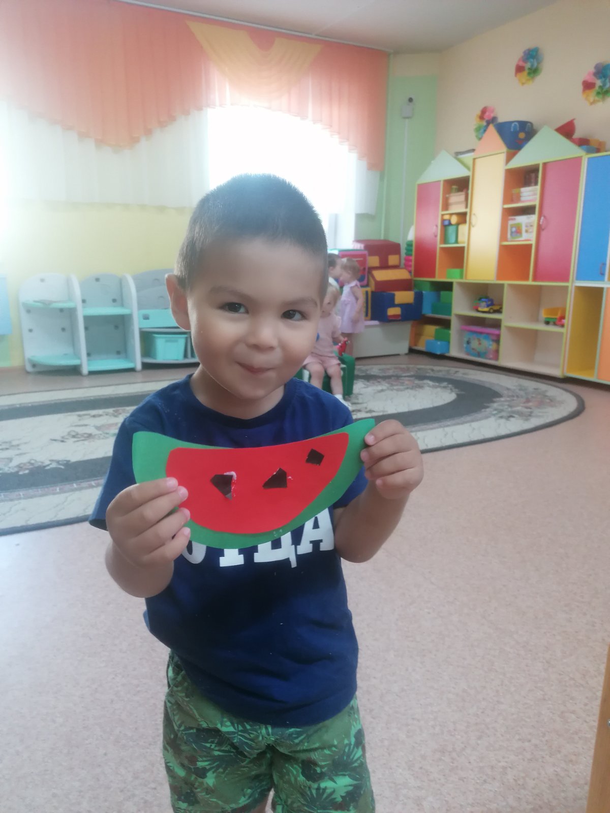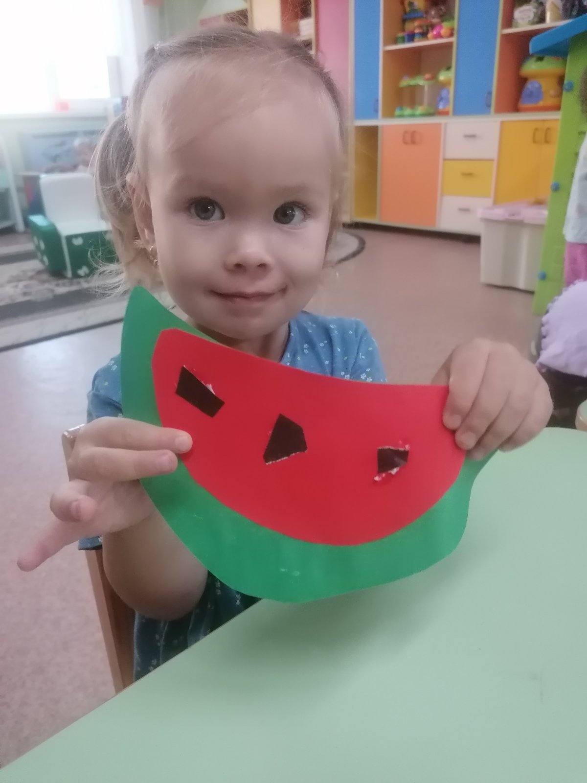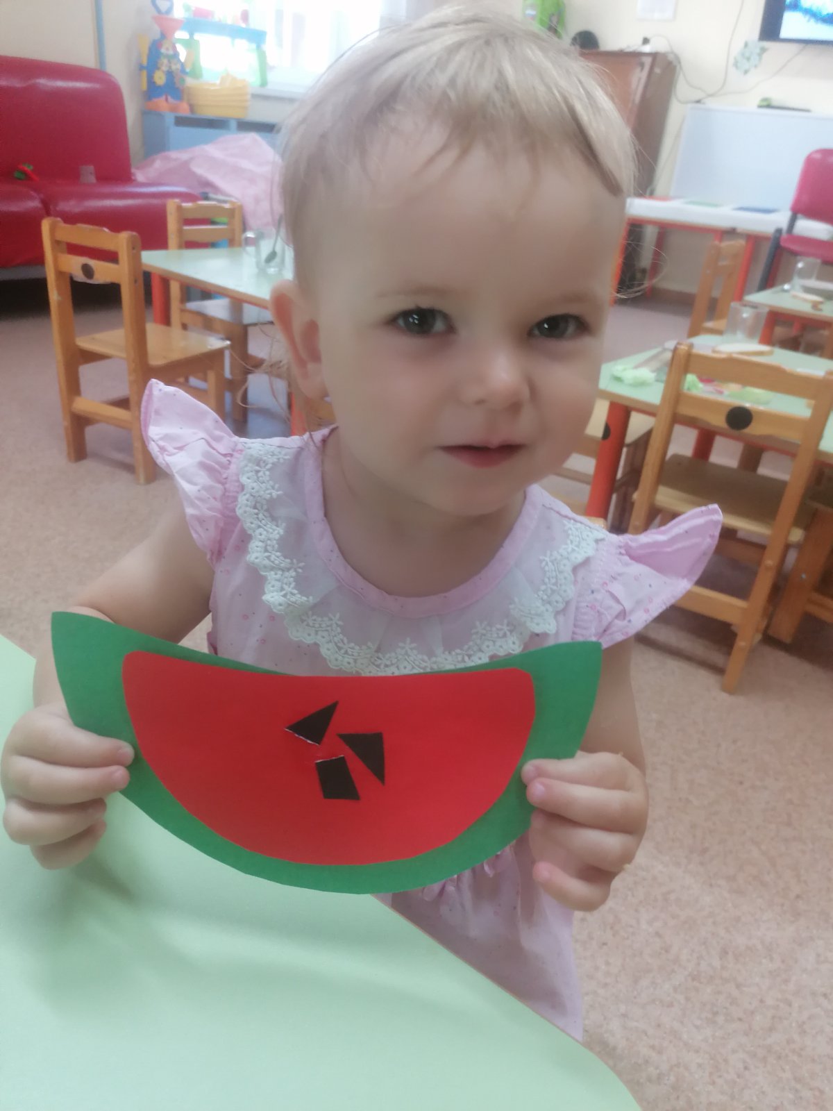 ?В заключении ребята сделали аппликацию "Арбузные дольки". Ах, какие красивые арбузные дольки получились у нас.