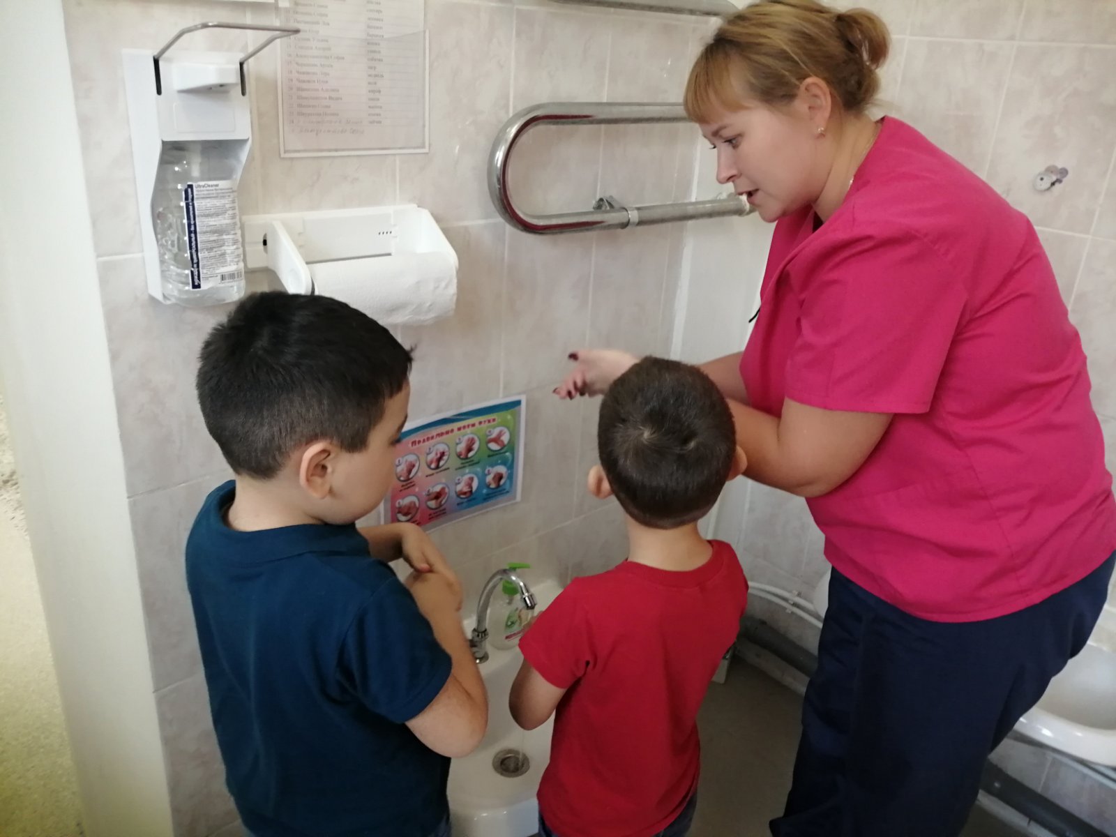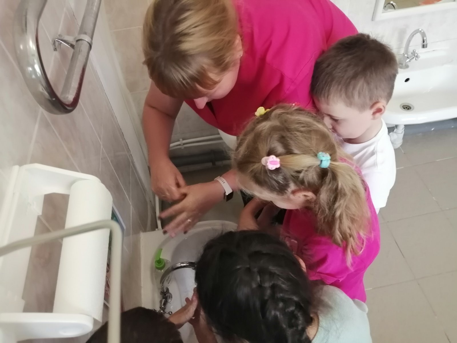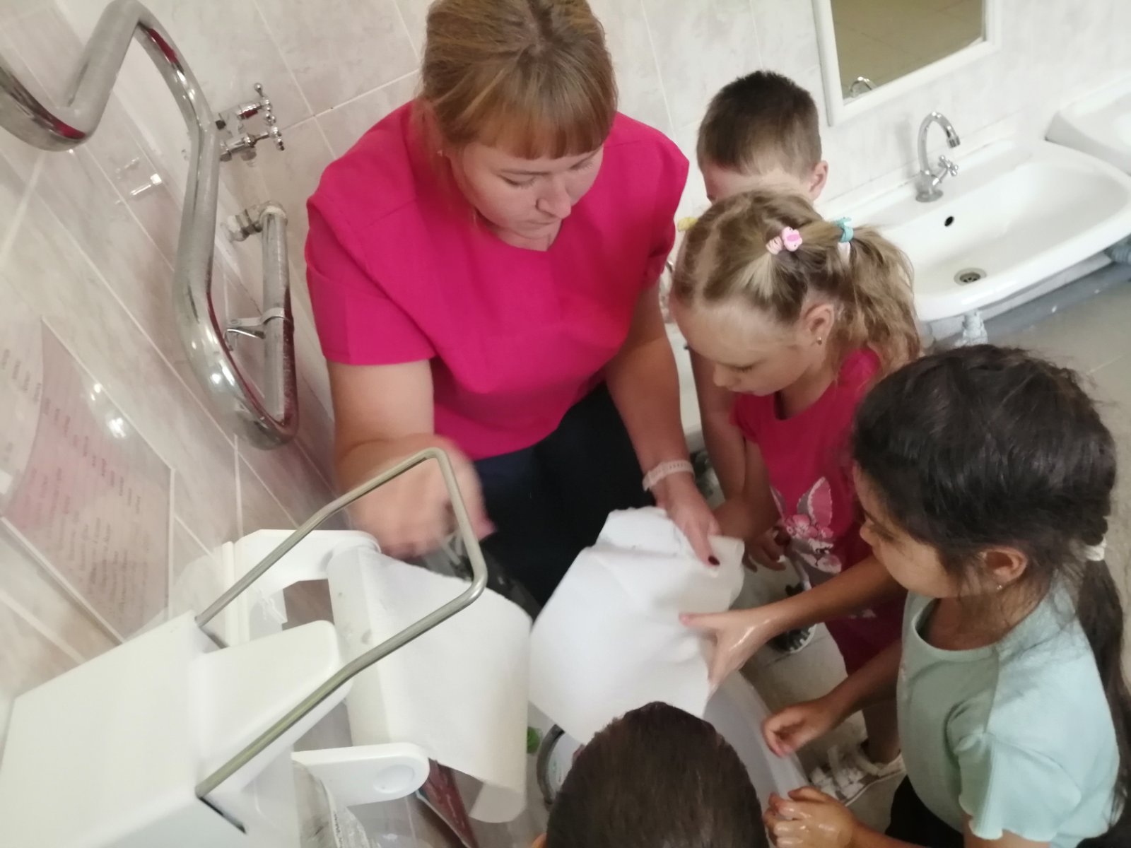 Алена Сергеевна провела ребятам познавательную беседу о гигиене рук, поиграли в игру "Моем руки чисто", отгадали загадки, закрепили правила мытья рук.