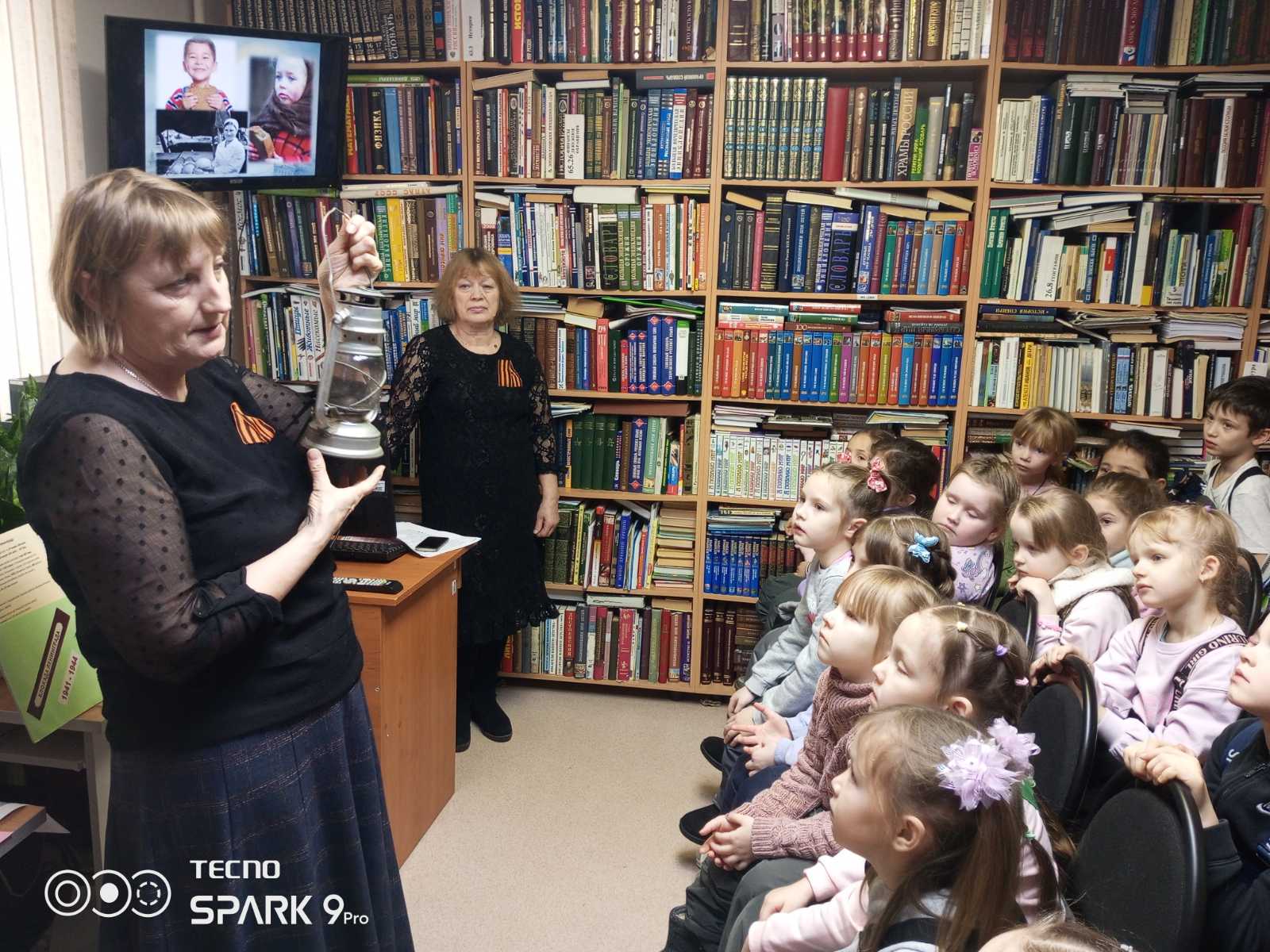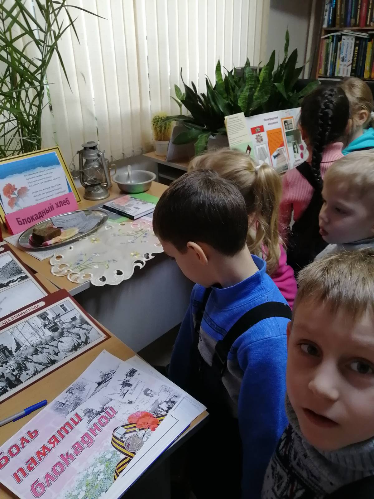 В библиотеке дети познакомились с выставкой, посвящённой снятию блокады Ленинграда. Посмотрели фильм о том, как в то тяжелое время 900 дней и ночей был оторван город от большой земли. Перекрыты все входы и выходы из города, это окружение называют блокадой. Продовольствие в город доставляли по"дороге жизни" - Ладожскому льду. Хлеб выдавали по карточкам, а норма была 125 грамм на человека. Но даже в это суровое время дети учились, а после учебы работали, чтобы помогать старшим.