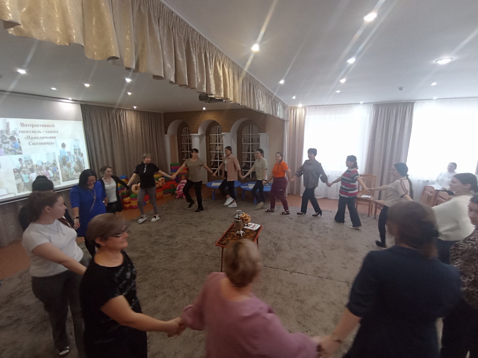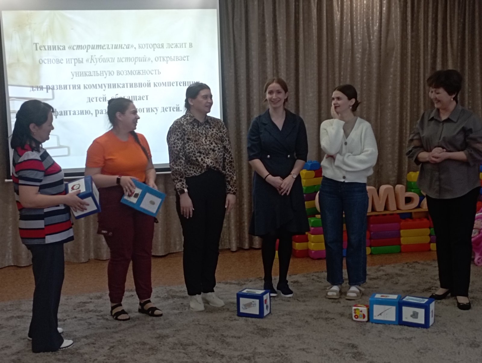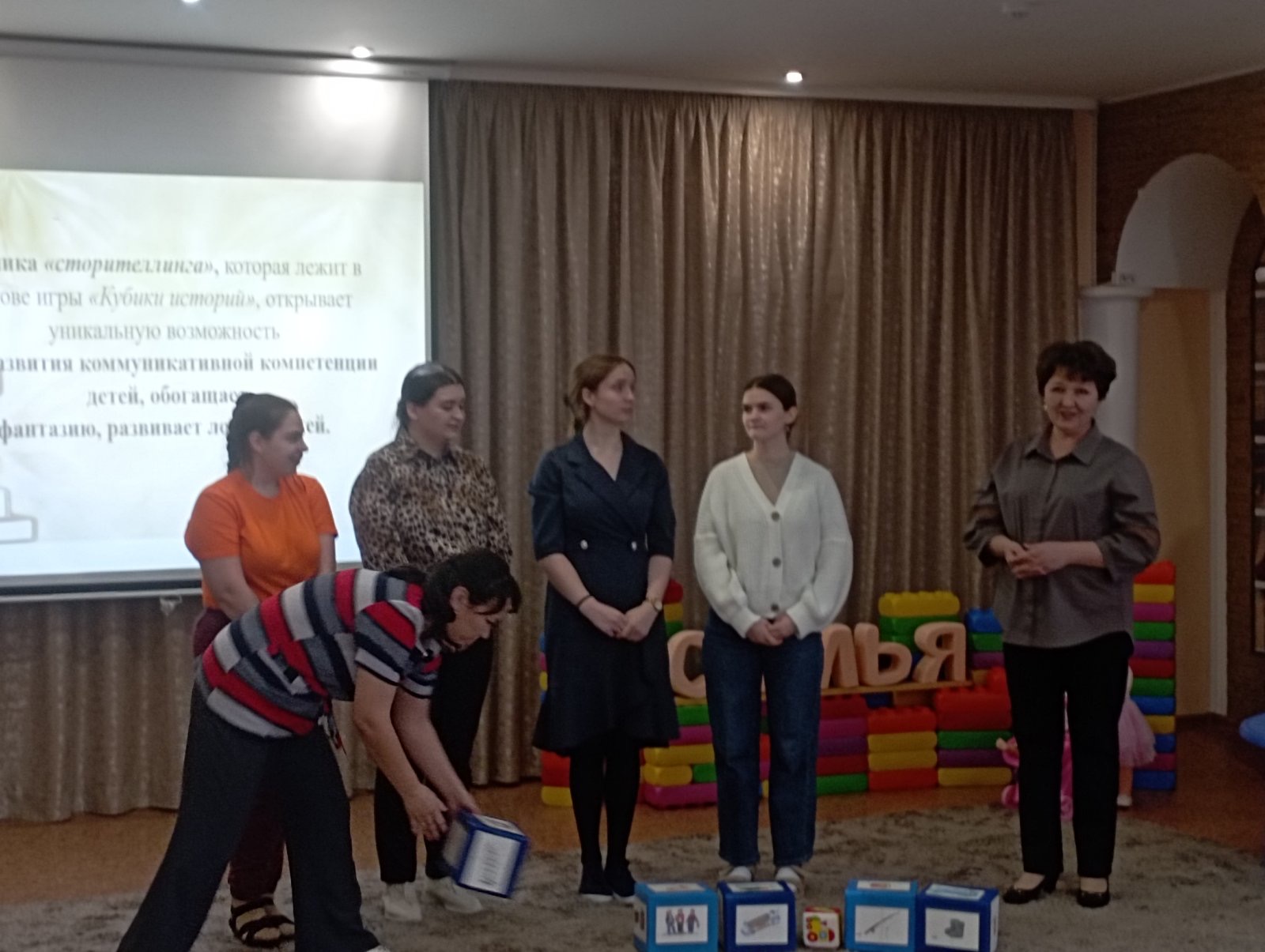 Молодые педагоги узнали, как можно превратить книжный уголок в Центр детской активности: викторины, игры, квесты, поэтические акции, проекты, участие в конкурсах детской книги, знакомство с детской поэтессой Н.А.Атабиевой, которая является частым гостем детского сада в рамках мероприятий "Встречи с интересными людьми", интерактивные спектакли, конференции и др. Альбина Рависовна познакомила педагогов с технологией сторителлинг и предложила с помощью кубиков историй выразить своё отношение к прошедшей встрече.