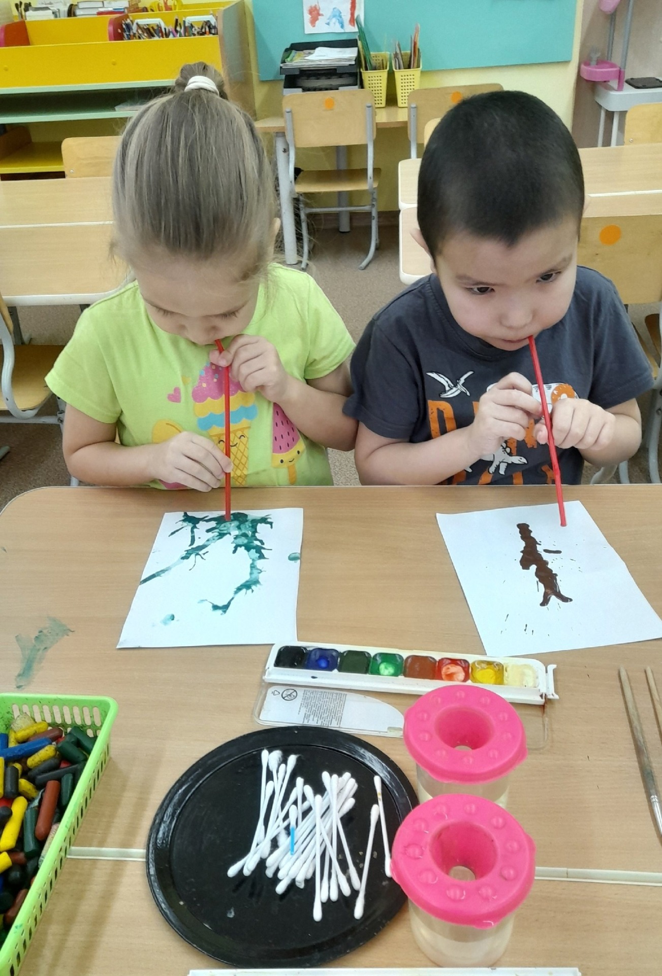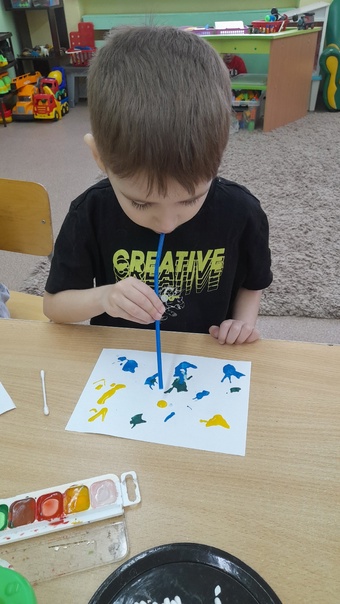 Раздувая цветные капли, кляксы нельзя точно предугадать, как они разойдутся, перельются друг в друга, и каков будет окончательный результат. Рассматривая их, ребёнок может видеть образы, предметы или отдельные детали. «На что похоже?», «Кого она тебе напоминает?» - такие вопросы развивают мышление и воображение. Дорисовать рисунок можно ватными палочками, кистью, фломастерами.