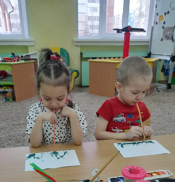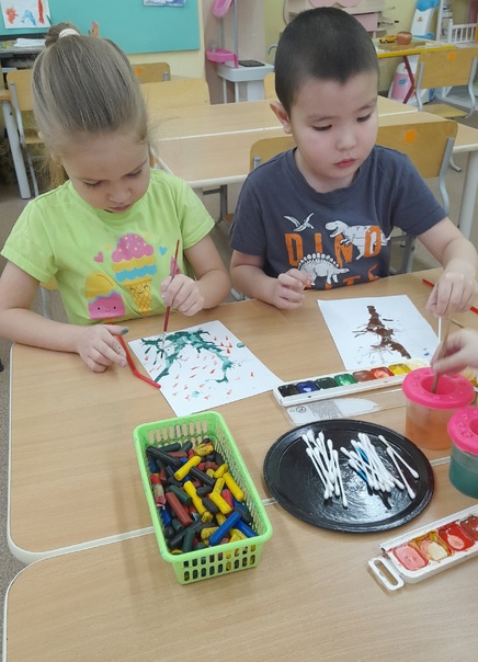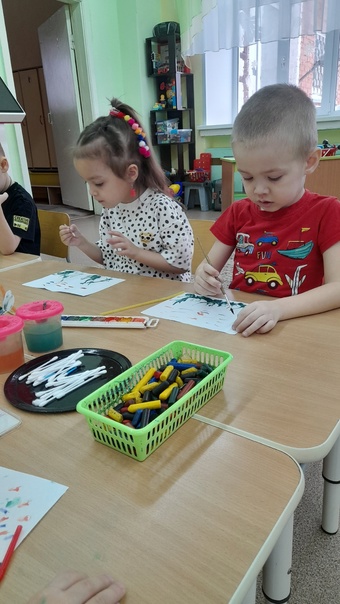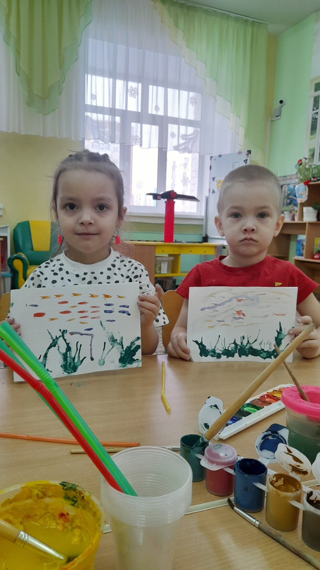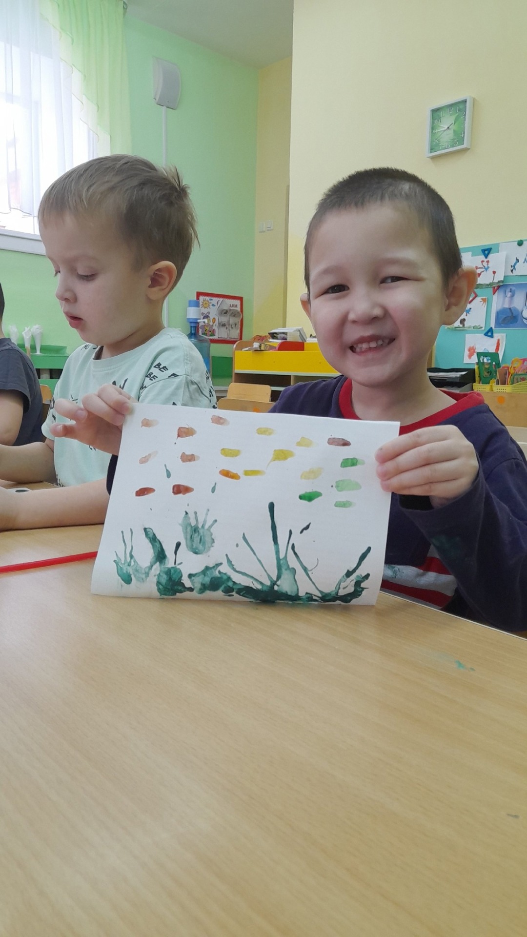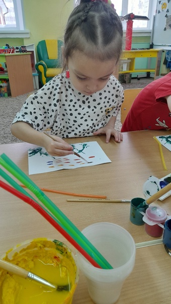 Сегодня у нас получились зимние деревья, водоросли в аквариуме с рыбками, цветы, птички и многое другое.