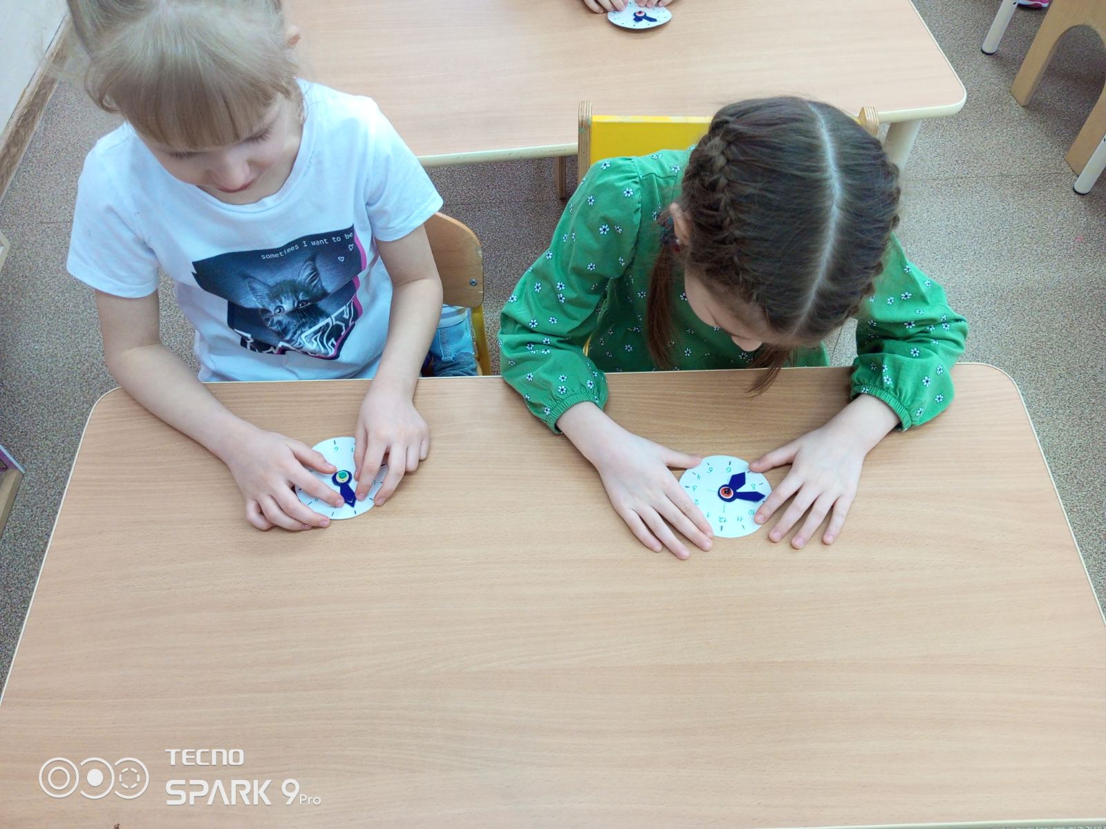 После этого настало время переходить к собственно понятию и определению времени. Чтобы понять, что такое секунда, мы наблюдали за секундной стрелкой часов – это один миг. Это миг, когда, например, хлопаешь в ладошки. Далее используя не настоящие, а самодельные циферблатные часы, мы познакомились с часовыми стрелками: часовая стрелка короткая и широкая, а минутная - длинная и узкая. Постепенно мы научились определять время ровно час, получас и начали усваивать минуты.