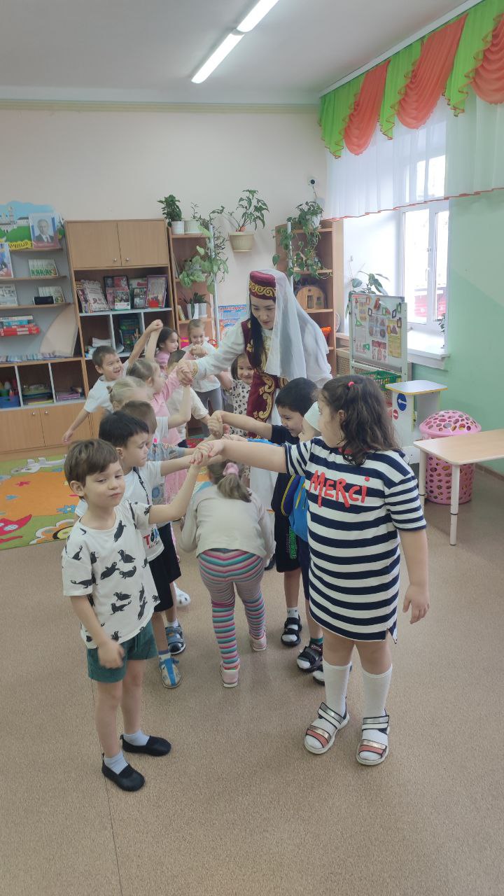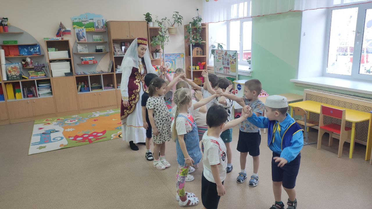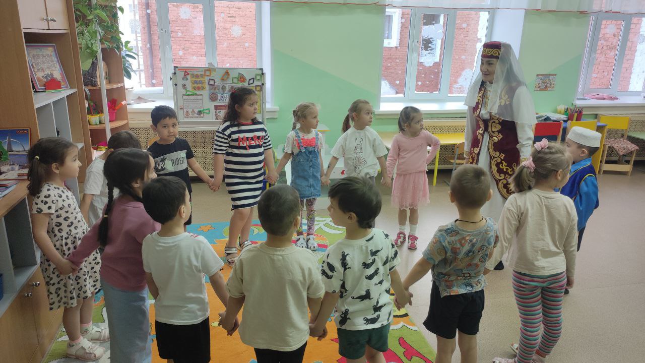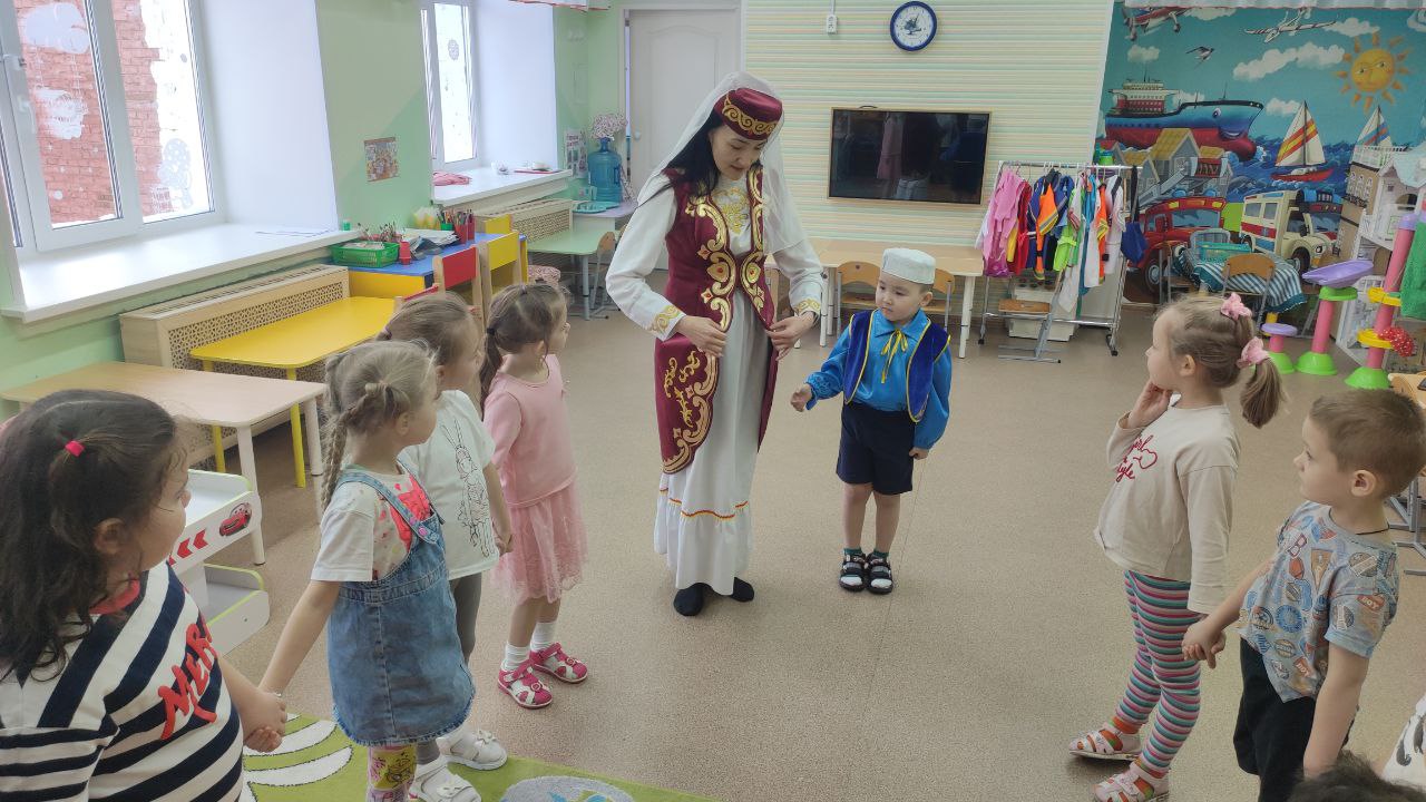 Собираясь к нам в гости в детский сад, она приготовила интерактивную программу, состоящую из песен, танцев, игр сибирских татар.Ребята с удовольствием рассмотрели женский национальный костюм сибирских татар, спели песню "Бэйрам буген" ("Праздник сегодня"), в которой говорится о том, что нужно радоваться солнышку и каждому дню жизни.