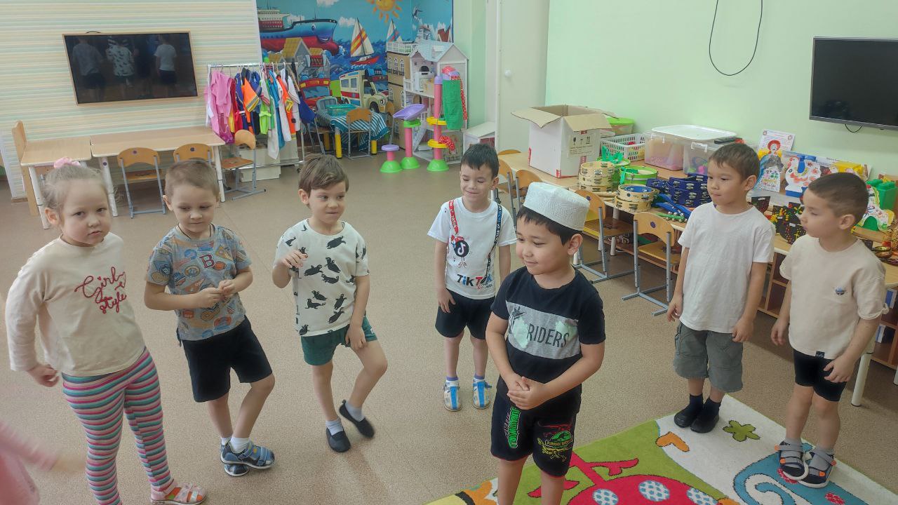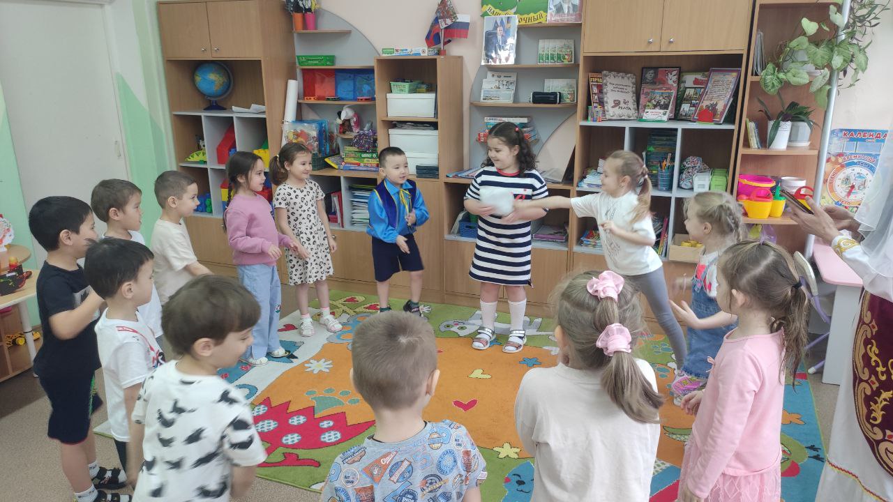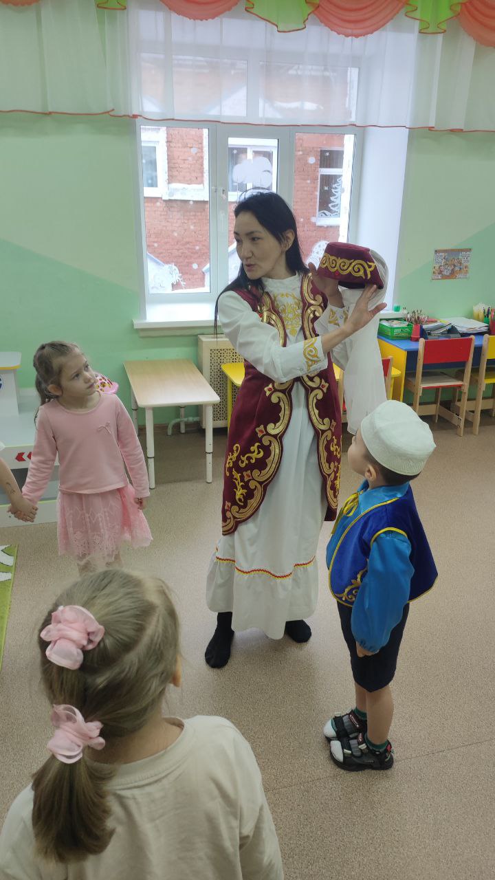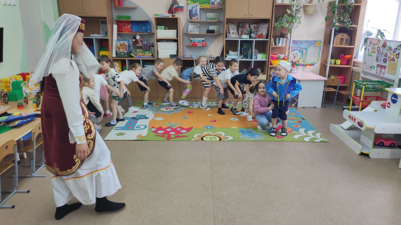 Собираясь к нам в гости в детский сад, она приготовила интерактивную программу, состоящую из песен, танцев, игр сибирских татар.Ребята с удовольствием рассмотрели женский национальный костюм сибирских татар, спели песню "Бэйрам буген" ("Праздник сегодня"), в которой говорится о том, что нужно радоваться солнышку и каждому дню жизни.