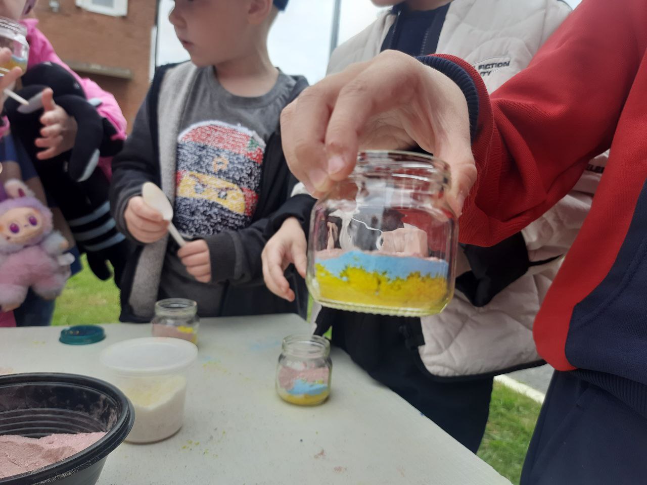 После эксперимента маленькие ученые использовали цветной песок в изготовлении красивых баночек.