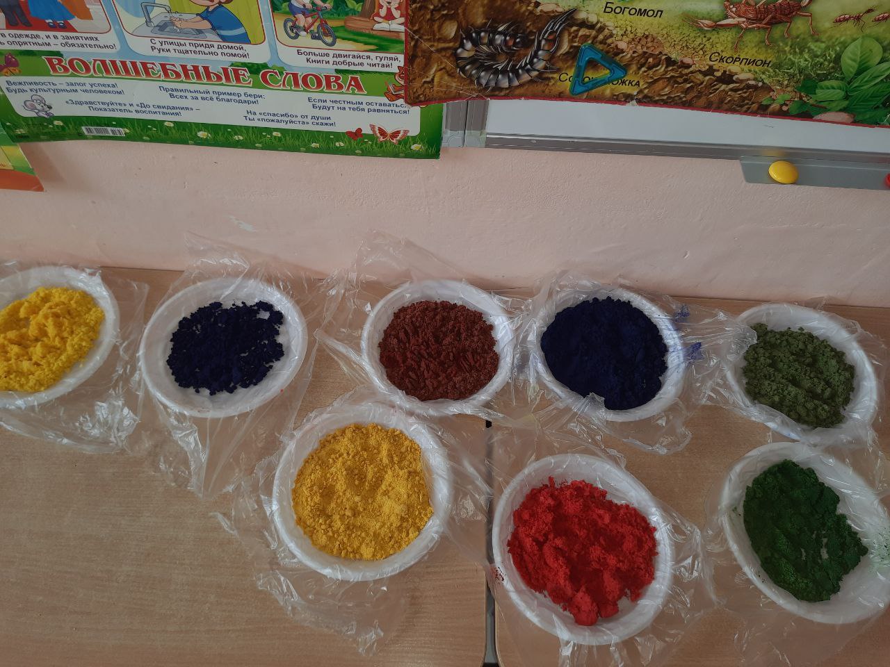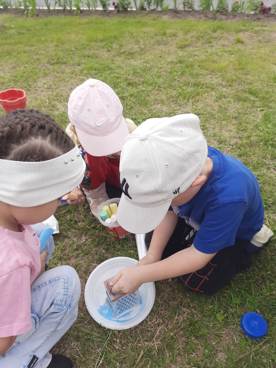 И мы приступили к следующему вопросу. С помощью гуаши и цветных мелков, натертых на тёрке, дети пробовали сделать цветной песок, цветную соль и цветную манную крупу. И все успешно получилось.