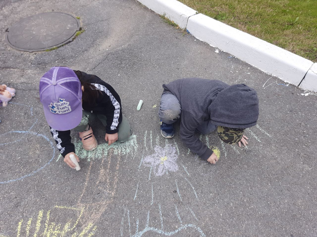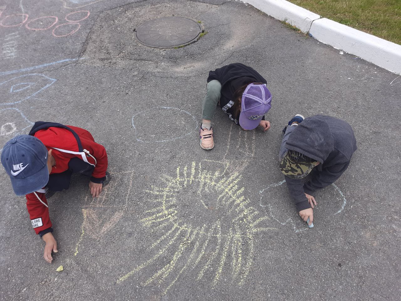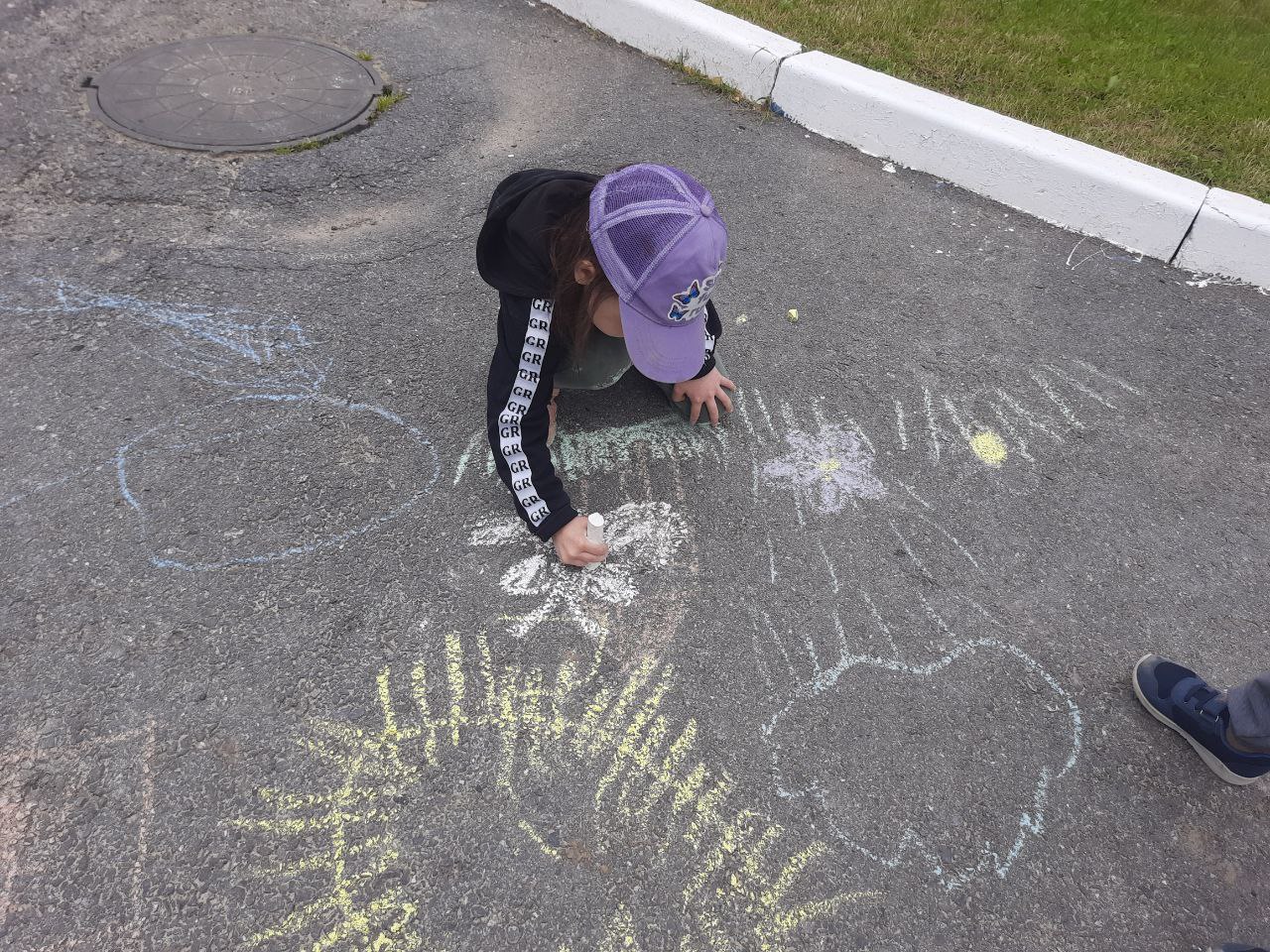 Разноцветные мелки в руках юных художников становились всё меньше и меньше, а асфальт расцветал чудесными и удивительными рисунками.