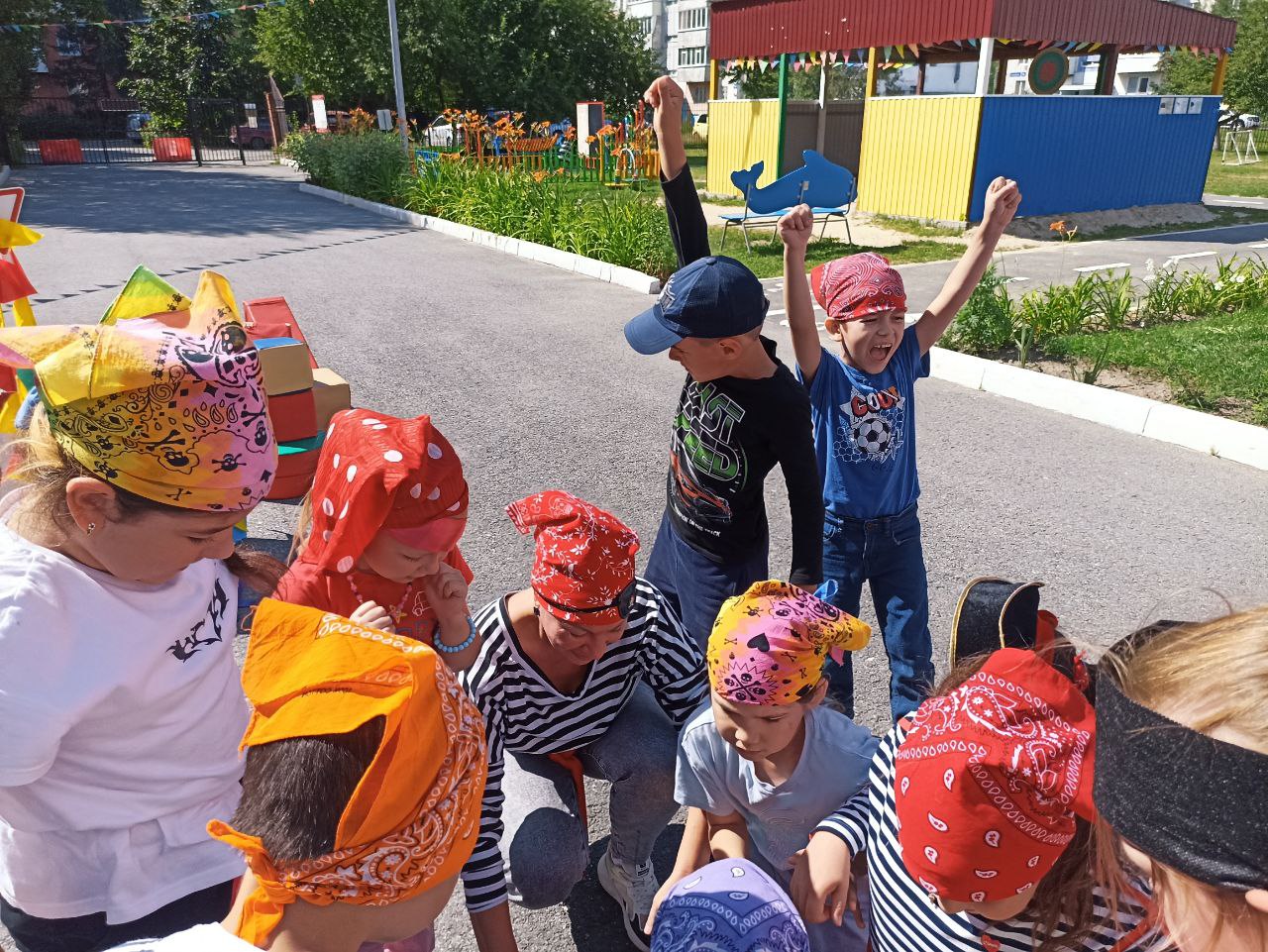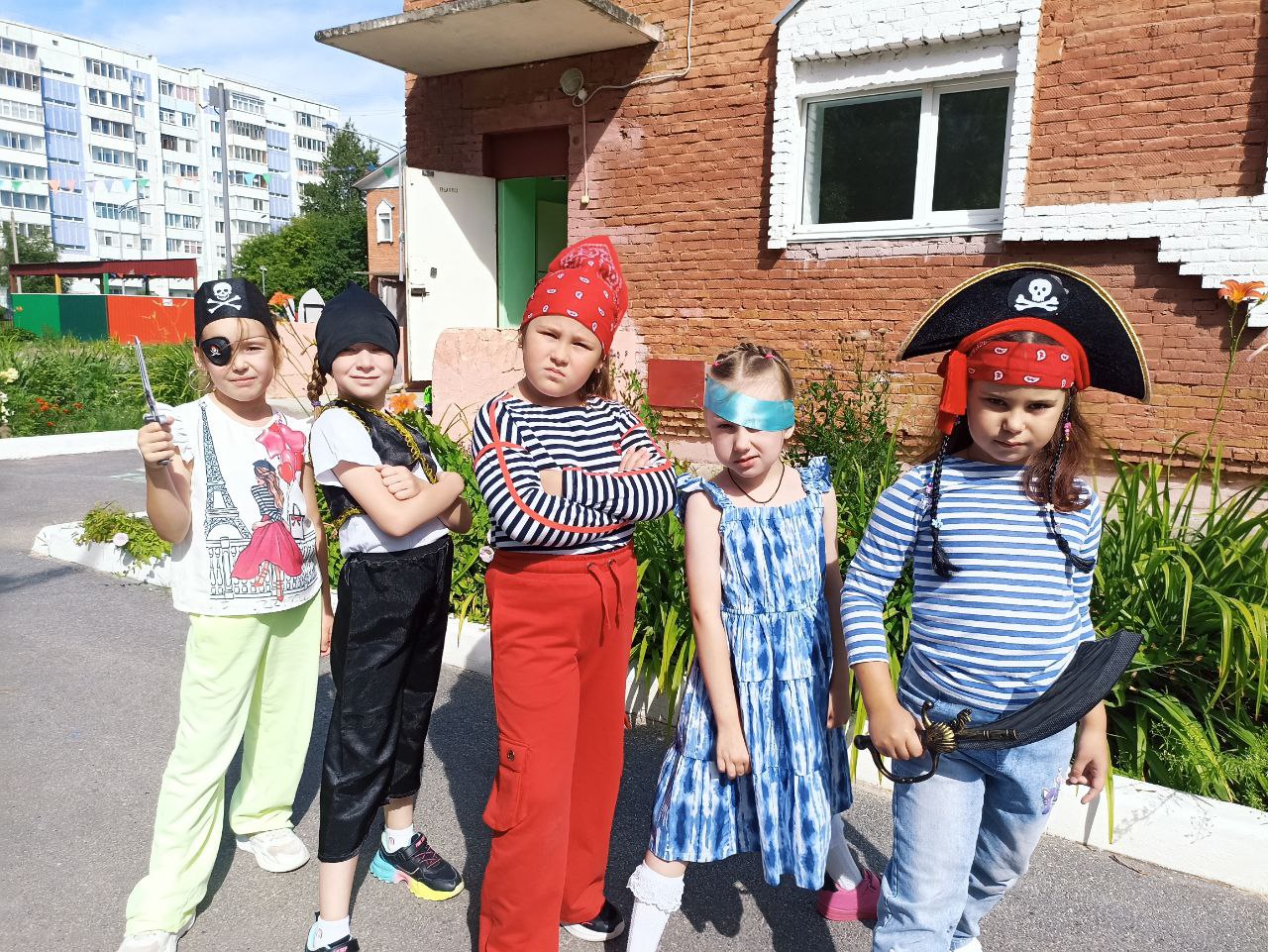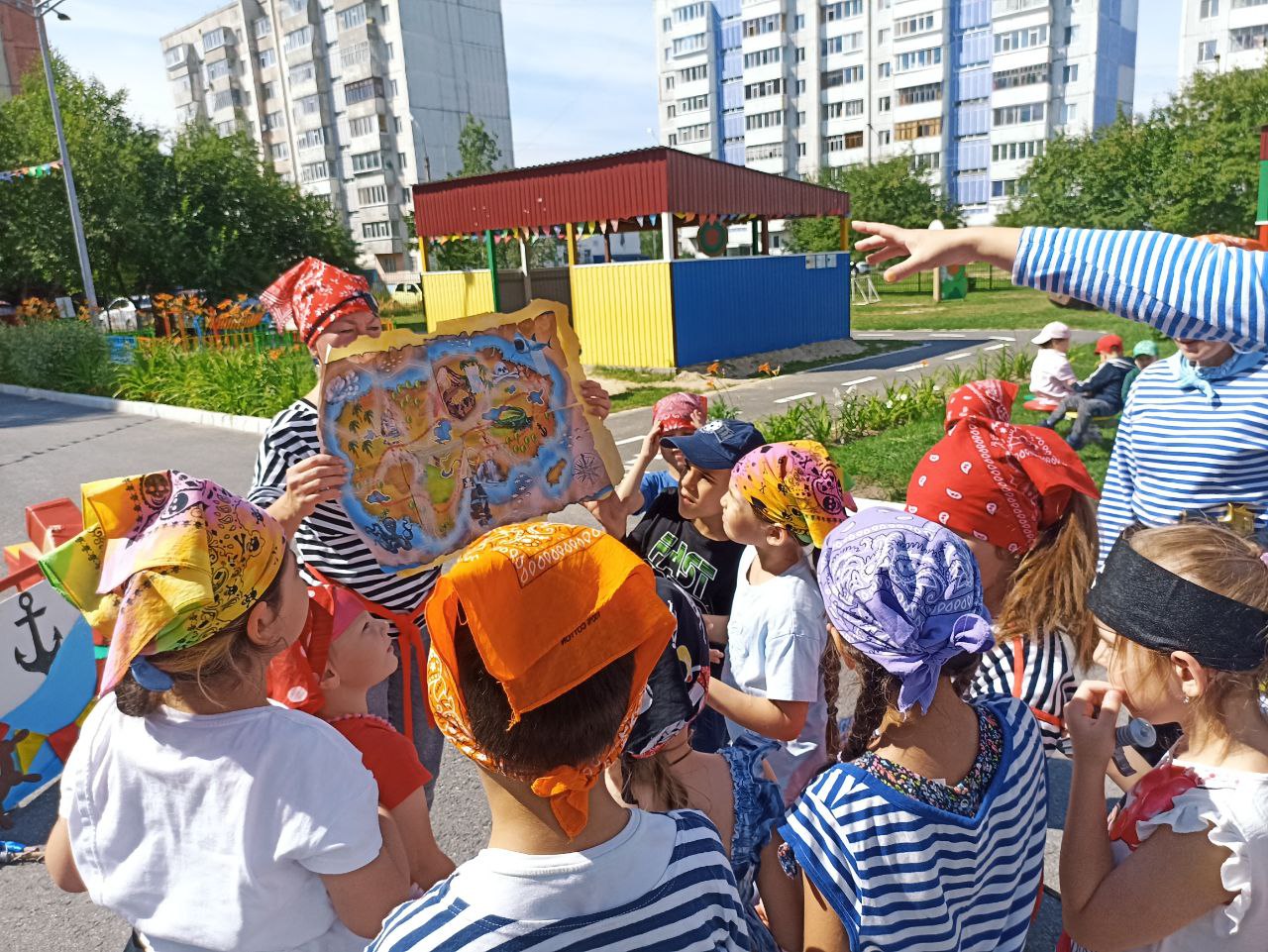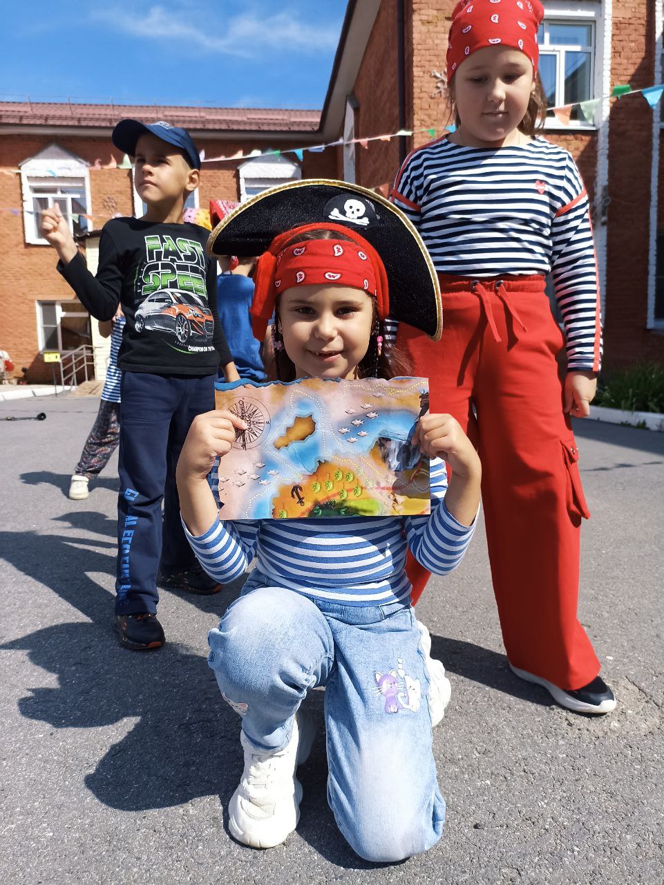 Перед тем, как отправиться в увлекательное путешествие, ребятам пришлось поискать карту, произнести клятву и исполнить танец юных пиратов. Дети с интересом совершали морское путешествие, участвовали в увлекательных соревнованиях. Ребята прошли все испытания и все таки нашли заветный сундучок