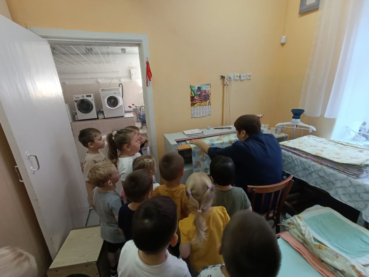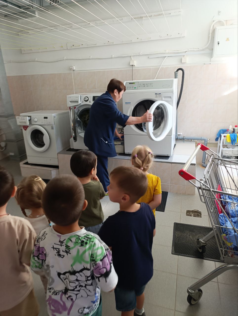 Прачечная стала вторым открытием для наших юных исследователей. Здесь дети узнали, как происходит стирка и глажка их любимых полотенец и постельного белья. Зоя Ивановна - машинист по стирке белья, в прачечной показала, как работают большие стиральные машины и рассказала о правилах гигиены белья.