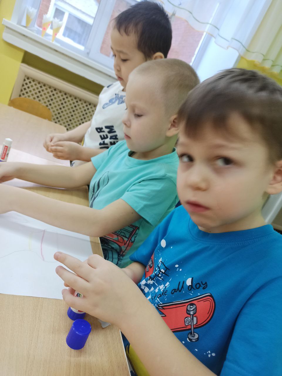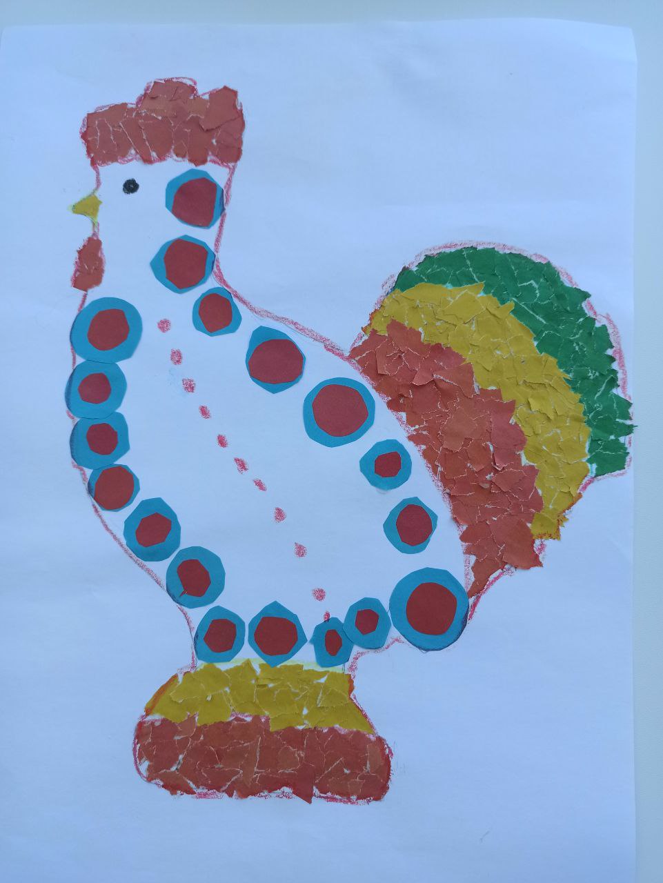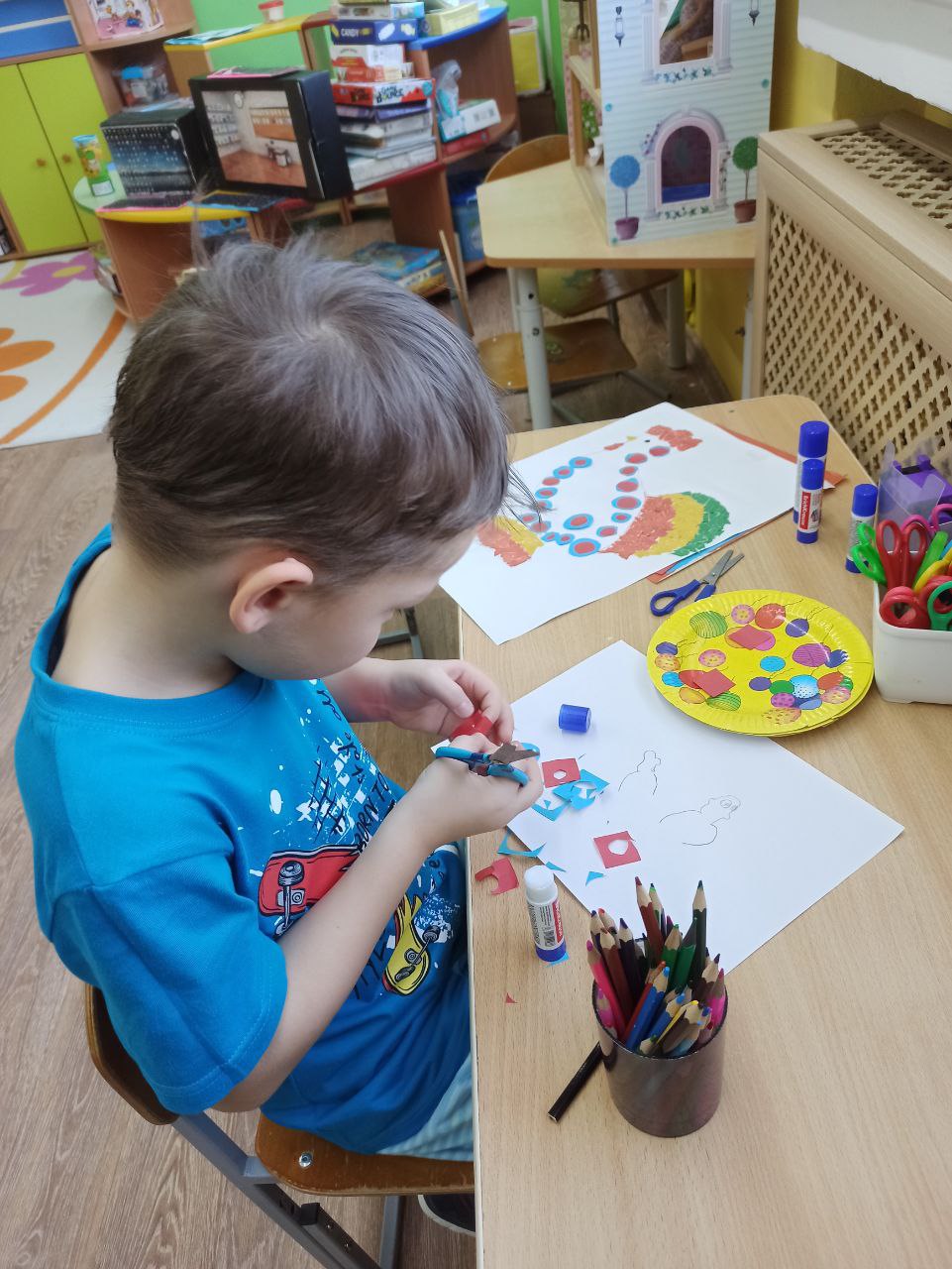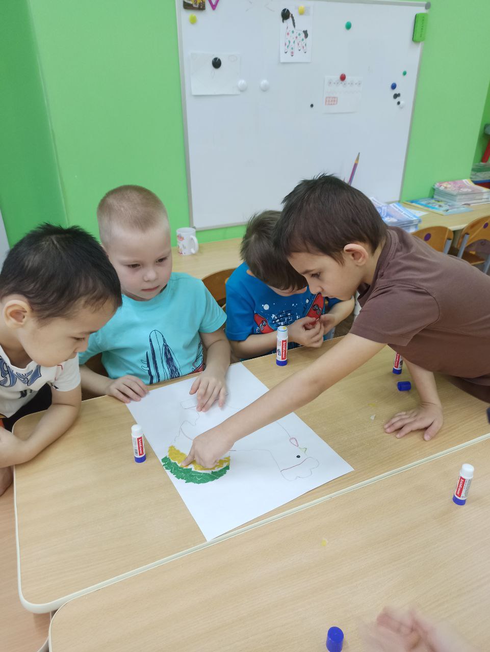 Наклеиваем: Намажьте клеем небольшой участок рисунка и вместе начинайте заполнять его обрывками, создавая свой уникальный узор.