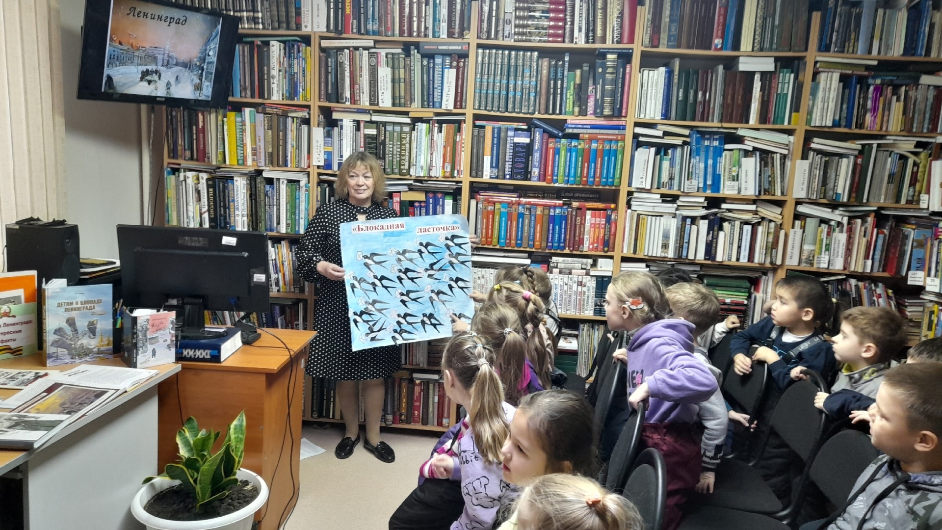 В библиотеке организована тематическая выставка, где дети рассмотрели экспонаты, прикоснулись к ним руками. Мы пополнили выставку плакатом "Блокадная ласточка", сделанным детьми. Ласточка с письмом в клюве – это символ надежды ленинградцев на лучшее, на скорую встречу с родными и близкими.